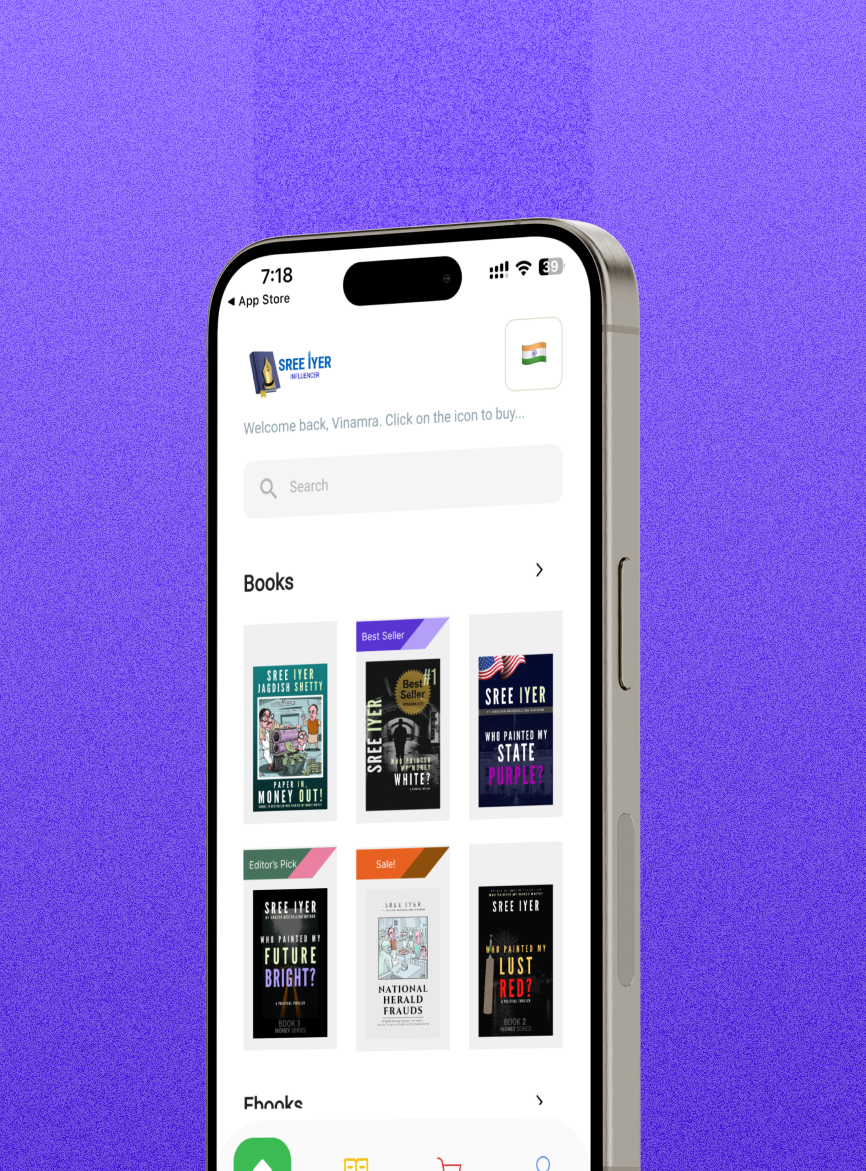 Discover the Sree Iyer app, your ultimate destination for purchasing his books, e-books, and exquisite, precision-crafted wooden art. Sree Iyer, a multifaceted personality, has not only established himself as an acclaimed author but also as a prolific inventor. With a collection of five non-fiction and five fiction books already published, he continues to work on captivating new projects that will soon grace the literary world.